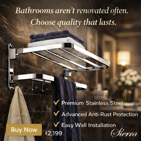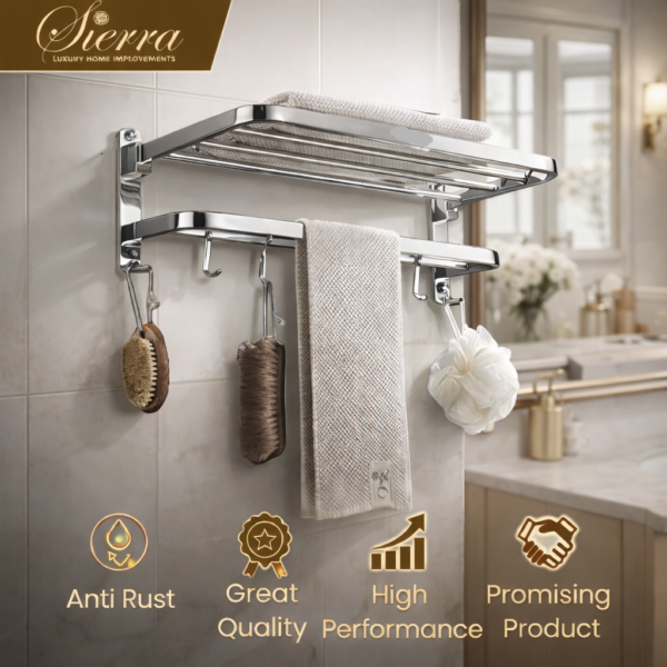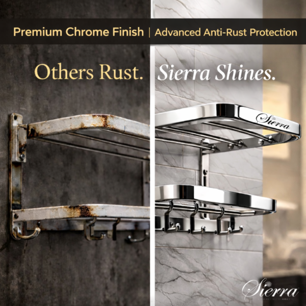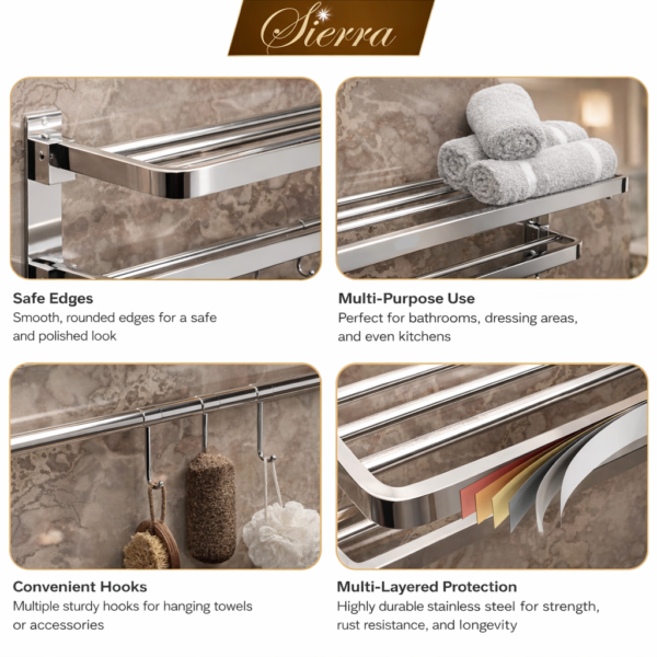 Exceptional build and size: Crafted with expertise Sierra Dual Towel Rack boasts a robust 24-inch structure. It is made up of premium heavy duty stainless-steel which provides it with sturdiness and durability. This product outperforms ordinary towel racks,assuring a long-lasting addition to your space. Sierra products have best in industry nickel chrome mirror finish that resists daily wear and tear and mantains shine.